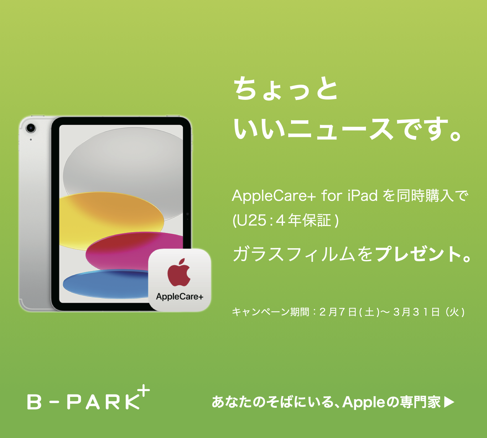【B-PARK+限定】iPad購入で「ガラスフィルム」プレゼント!