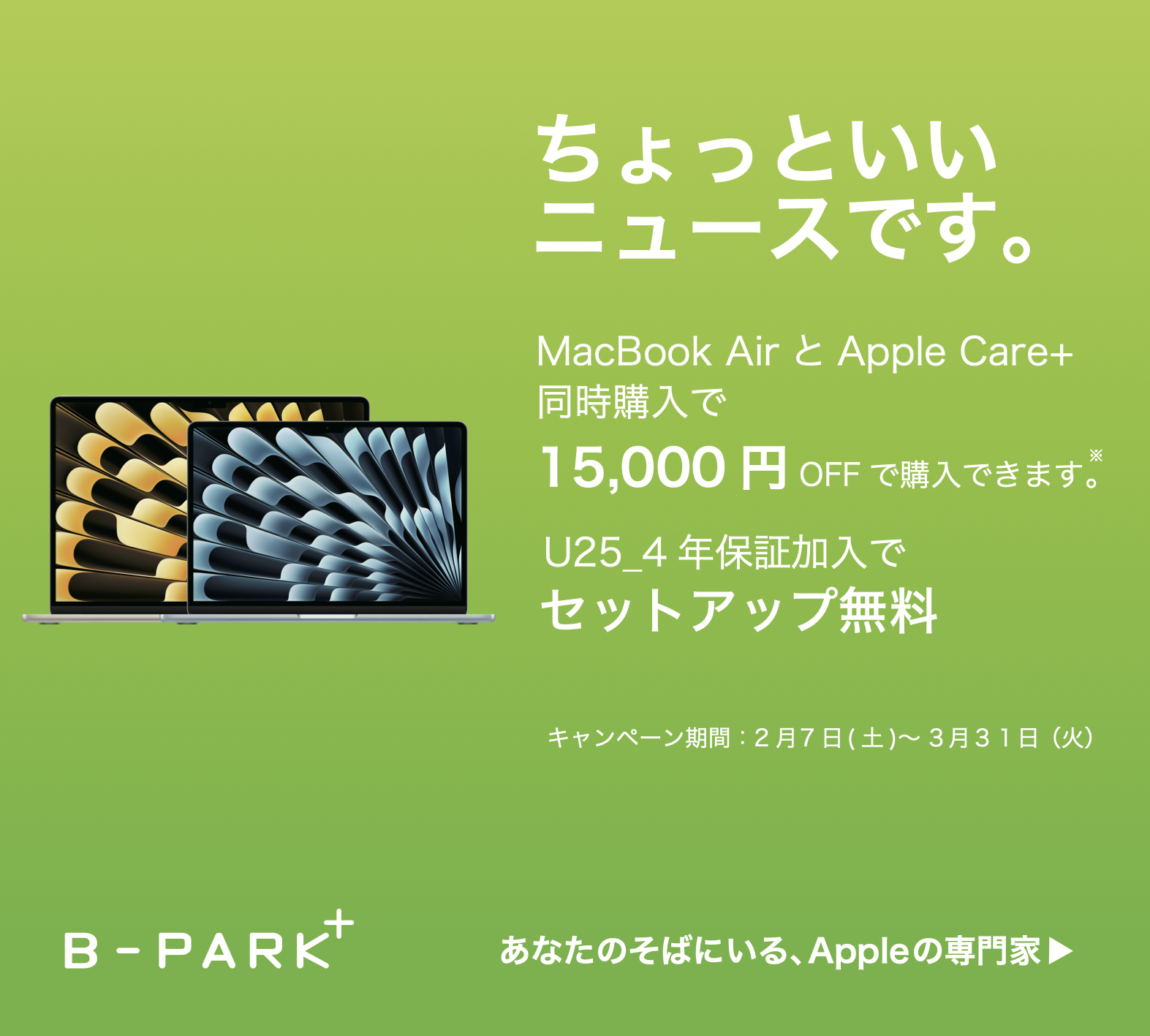 新生活に向けて、MacBook Airを「一番おトクに、一番安心して」手に入れるなら、ぜひB-PARK+へお越しください!